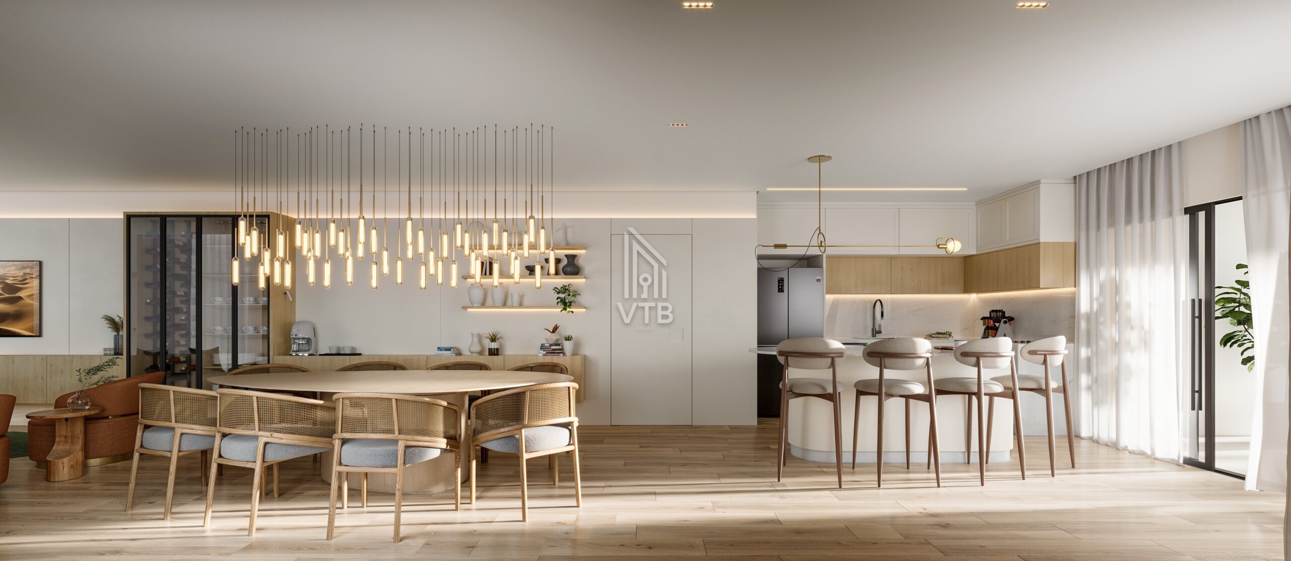 • Living espaçoso integrado à sala de estar, jantar e cozinha